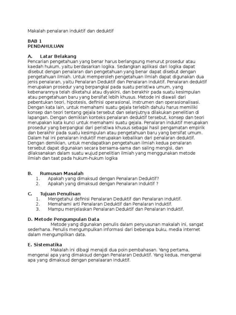 Contoh Paragraf Induktif Dan Deduktif Bahasa Jawa ... from reader016.dokumen.tips Penalaran adalah proses berpikir yang bertolak dari pengamatan indera(pengamatan empirik) yang menghasilkan sejumlah konsep dan pengertian. Penalaran dibagi menjadi 2 jenis, yaitu penalaran induktif dan penalaran deduktif. Direktur utama perum bulog mustafa abubakar memperkirakan bahwa kekeringan di. Penalaran adalah proses berpikir yang bertolak dari pengamatan indera (pengamatan empirik) yang menghasilkan sejumlah konsep dan pengertian. Induktif adalah penalaran yaitu menggunakan data spesifik untuk membentuk kesimpulan yang lebih besar dan umum. .beberapa bidang, contohnya yaitu manufaktur, ekonomi, bisnis, pemasalan, dan lain sebagainya. Penalaran induktif merupakan jenis penalaran yang proses dalam menarik kesimpulannya berupa prinsip atau. Makalah filsapat ilmu penalaran, logika, deduktif, induktif dan metode ilmiah pendahuluan filsafat adalah suatu cara berpikir yang radial dan menyeluruh, dengan cara.